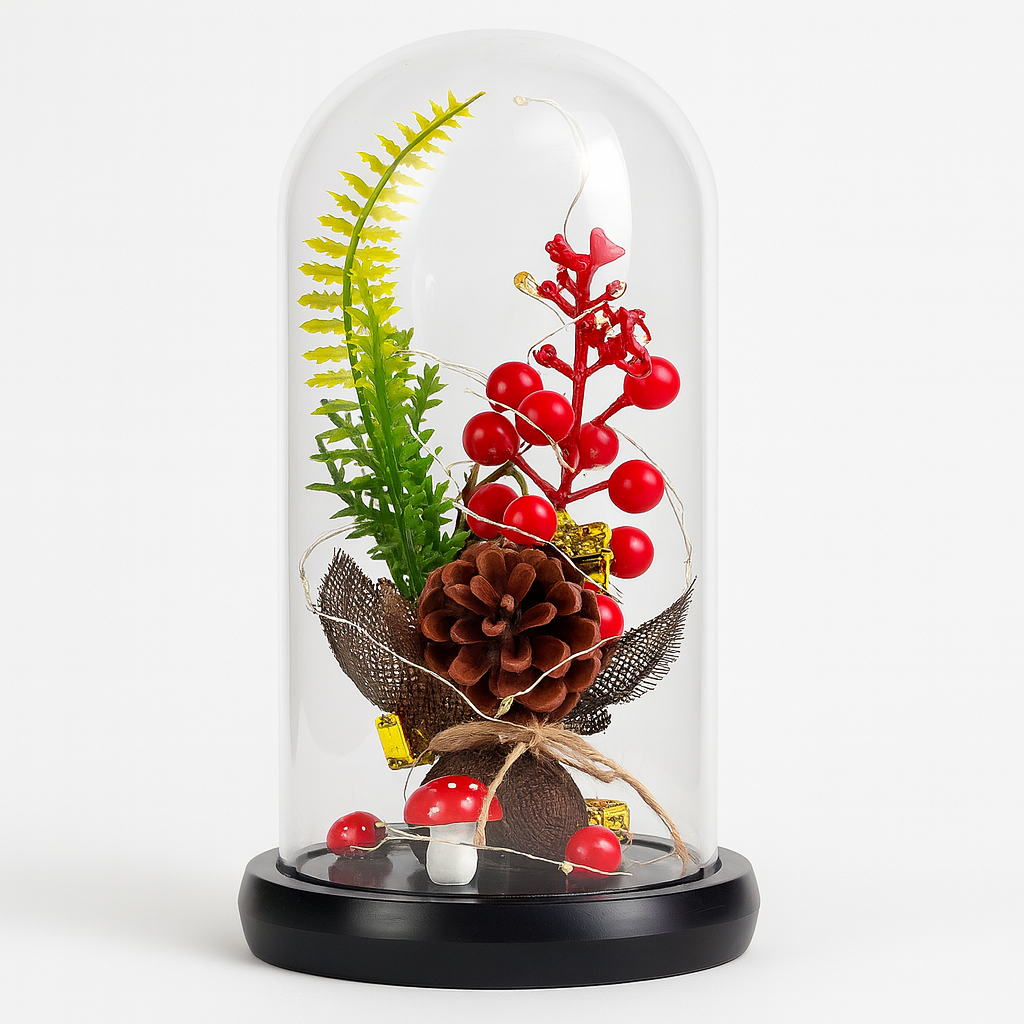 La cúpula crea un ambiente navideño sofisticado gracias a su iluminación LED cálida y a los detalles internos (ramas, frutos y base decorativa). Es una pieza que viste el ambiente sin esfuerzo y aporta ese toque “premium” que destaca en mesas, repisas o escritorios.